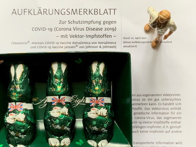 Die Autos stauen sich in einer langen Schlange. Wir sind nicht die einzigen, die sich im Schmuddelwetter auf den Weg zum Corona-Impfzentrum im Flughafen Tempelhof gemacht haben. Im Stau warten dauert mir zu lange. Ich gehe bei Wind & Wetter einen Kilometer über die alte Rollbahn und komme gerade noch rechtzeitig an. Dann geht alles ganz schnell: in einer Viertelstunde sind die Formalitäten erledigt, und ich habe meine erste Impfung mit AstraZeneca erhalten. Bis zu 3.000 Impflinge können sie in Tempelhof täglich durchschleusen, erzählt mir ein Bundeswehrsoldat beim Check-In, heute seien es aber nur 2.500. Organisiert ist der Ablauf mit deutscher Gründlichkeit und viel Personal, das freundlich immer wieder den Weg weist. Am Ende müssen die Impflinge noch eine Viertelstunde in einer Halle warten, dann sind wir durch. Am Ausgang bekommen wir zur Belohnung drei Osterhasen mit der britischen Flagge geschenkt. Was mag diese Geste bedeuten? schießt es mir durch den Kopf.