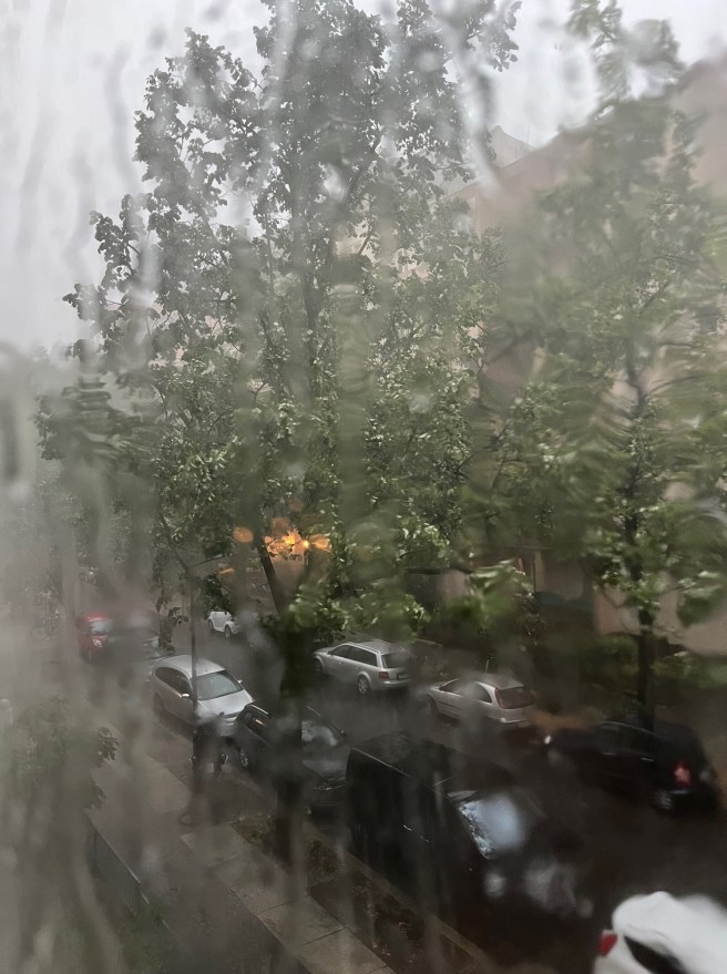 Dräuend schwül ist es an diesem Tag. Später wird es immer dunkler, es beginnt zu regnen, immer stärker wird der Regen. Gut so, denke ich mir. Es war in den letzten Wochen viel zu trocken. Wind kommt auf und peitscht den Regen gegen die Fenster. Gebannt schaue ich erst einmal zu. Dann bemerke ich, dass sich das Wasser zwischen den Doppelfenstern sammelt. In einem Zimmer dringt es sogar durch die Fensterrahmen – im Nu bildet sich eine Lache auf dem Boden. Im Nachbarzimmer ist die Lage nicht so schlimm, aber ich muss auch dort die Fensterbänke trocknen. Zum Glück dauert der Schlagregen, den ich so noch nie in unserer Wohnung erlebt habe, nicht lange. Das Ungemach in den anderen Zimmern, die dem Sturmregen ausgesetzt waren, hält sich in Grenzen.