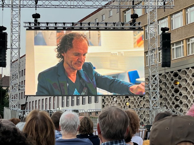 Glück gehabt! Wir erreichen gerade noch rechtzeitig die ehemalige Stasi-Zentrale in Berlin-Lichtenberg – nicht zum Verhör (diese Zeiten sind zum Glück vorbei!), sondern zum Filmabend. Im August gibt es dort die schöne Reihe “Campus-Kino. Filme in der Stasi-Zentrale“. Der Eintritt ist frei und der Zuspruch groß. Die Stühle stehen dicht an dicht; dafür gibt’s genug Platz für die Beine. Wir ergattern noch zwei Plätze in der Mitte, die Dämmerung setzt ein. Film ab. Zu sehen ist an diesem Abend “Olaf Jagger”, eine sogenannte Mockumentary, also ein fiktionaler Dokumentarfilm. Mit Olaf Schubert, dem Alter Ego des Dresdener Multitalents Michael Haubold, lassen wir uns auf eine skurril-witzige Spekulation ein. Was wäre, wenn seine Mutter, die beim legendären DDR-Jugendsender DT64 gearbeitet hat, beim ersten Konzert der Rolling-Stones 1965 in Münster auf Mick Jagger getroffen und der One-Night-Stand nicht ohne Folgen geblieben wäre?