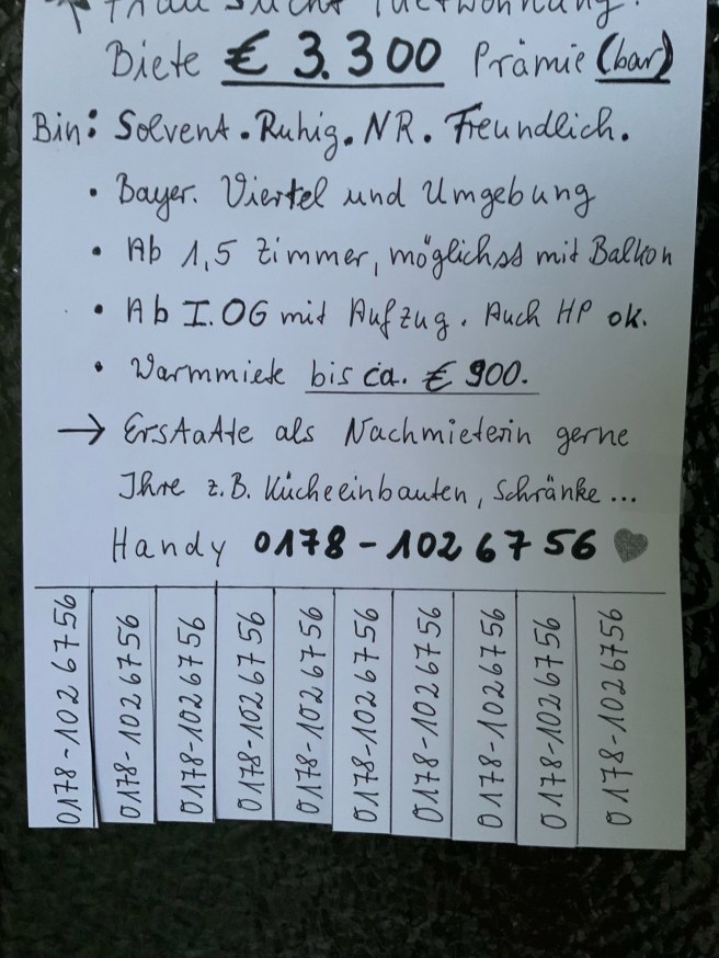 Die Angst geht um in deutschen Landen. Was mache ich, wenn meine Wohnung gekündigt wird und ich keine Alternative finde? In ihrer Not greifen viele zur Selbsthilfe, hängen Zettel aus und versprechen hohe Belohnungen für eine Vermittlung. Neulich bot eine Familie 5.000 Euro an. Letzte Woche hing ein Hilferuf an unserer Haustür: 3.300 in bar für eine Wohnung ab 1.5 Zimmer. Und sie ist bereit, dafür monatlich 900 Euro Miete zu zahlen; natürlich wird sie Kücheneinbauten und Schränke übernehmen. Kürzlich wurde der Untermietvertrag eines Mitarbeiters in einen Hauptmietvertrag gewandelt – neun Hunderter wurden dafür verlangt, bar auf den Tisch. Die Lage bei Wohnimmobilien wird sich in den nächsten Jahren weiter dramatisch verschärfen: es wird in Deutschland zu wenig, zu teuer und zu aufwändig gebaut. Im Musterland der Bürokratie gibt es nicht weniger als 3.500 Bauvorschriften.