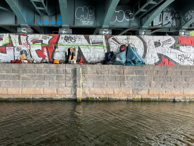 Einen Cocktail zum Abschied nehmen wir im Katharinenhof, direkt am kleinen Bootshafen gelegen. Unter einer Brücke habe ich ein Zelt gesehen. Hier lebt einer von 55.656 (Anfang 2024 laut KI) wohnungslosen Menschen in Berlin, in Sichtweite vom Katharinenhof. “Residenz-Wohnen und Pflege mit Stil in Berlin. Leben in fantastischer Lage am Spandauer See” ist auf dessen Homepage zu lesen. Im “Uferparadies” ist eine 1-Zimmer-Wohnung inklusive zahlreicher Serviceleistungen ab 2.000, — € monatlich zu haben. Wie von selbst kommen unsere Gespräche auf die Sozialversicherungssysteme. Die Kosten für Gesundheit, Pflege und Rente werden nicht länger zu finanzieren sein. Dänemark hat das Renteneintrittsalter ab 2040 auf 70 Jahre erhöht, natürlich wird es dort Ausnahmen geben (müssen). Hierzulande scheuen sich die Politiker:innen von jeher, diese Probleme anzugehen; irgendwo drohen immer Wahlen. Am 14. September stehen im bevölkerungsreichsten Bundesland Nordrhein-Westfalen Kommunalwahlen an. Nicht nur bei der SPD geht in ihrer einstigen Hochburg die blanke Angst um.